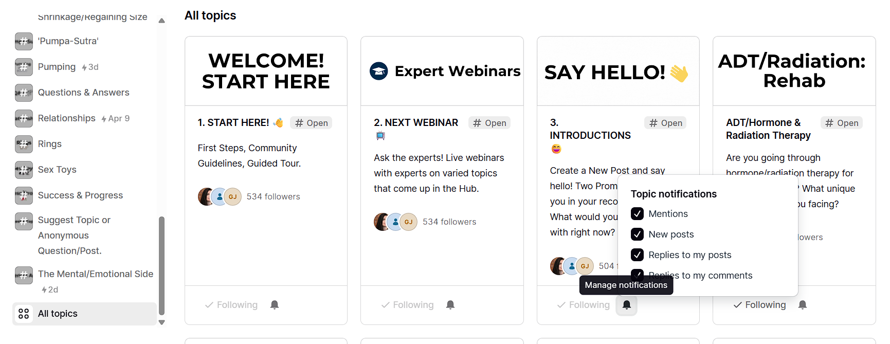 Watch our video guide to learn how to find Topics you're interested in and change the type of email notifications you're receiving for each one.